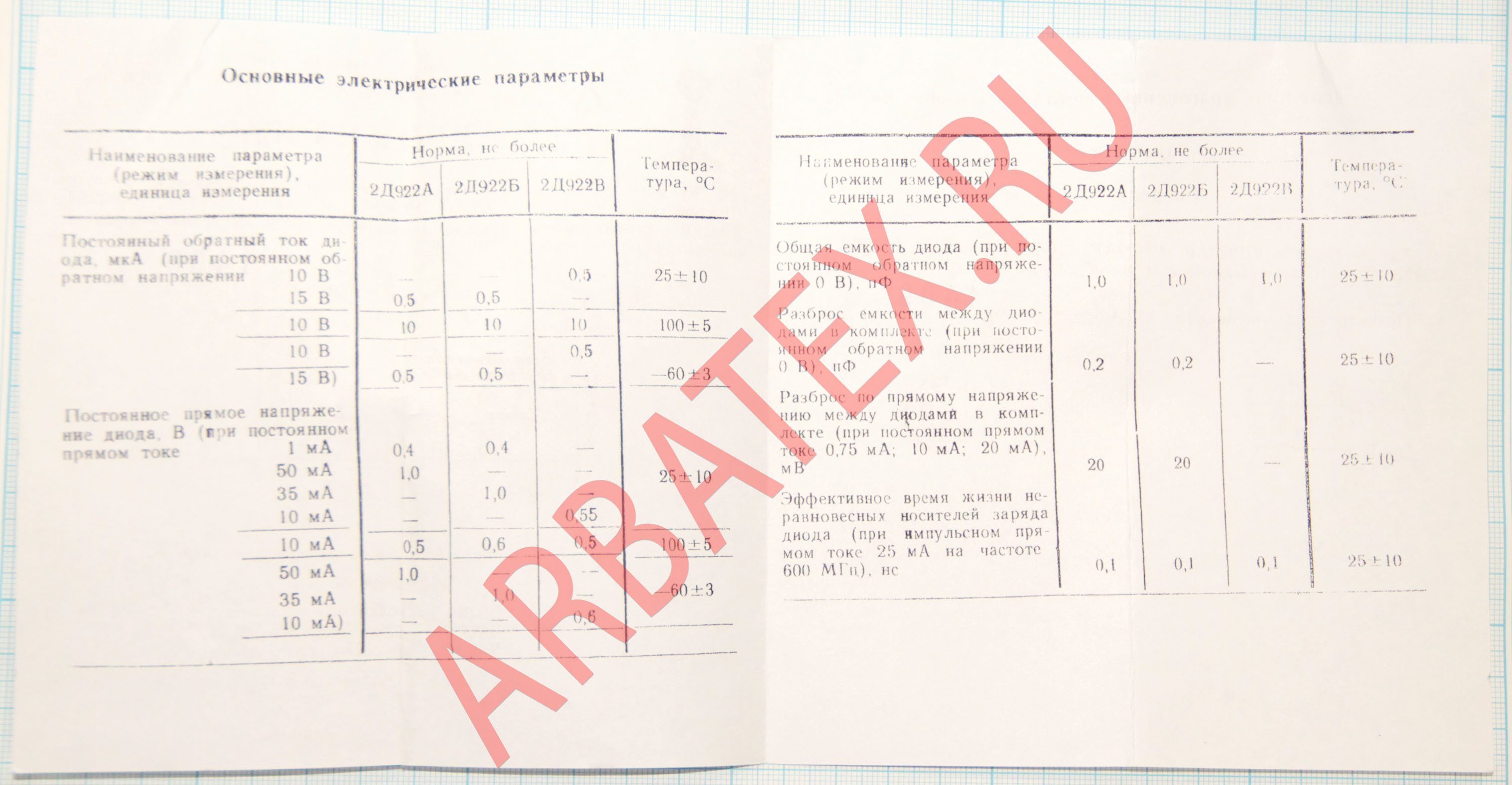 Для схем, требующих малого разброса параметров диодов, диоды 2Д922А, 2Д922Б, КД922А, КД922Б могут поставляться в комплекте из двух или четырех диодов, подобранных по прямому напряжению и общей емкости.