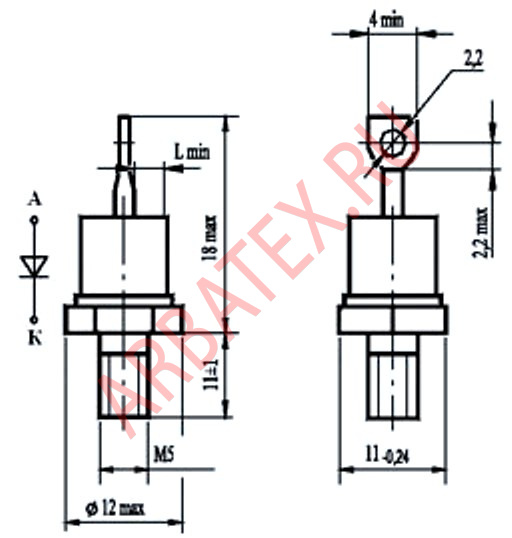 У диодов прямой полярности анодом является основание корпуса, обратной полярности — жесткий вывод.