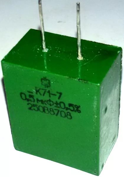 К71-7 250В 0.5мкф конденсатор постоянной ёмкости на основе полистирольной плёнки, герметизированный прецизионные. Предназначен для работы в цепях постоянного, переменного, пульсирующего токов и в импульсных режимах.
