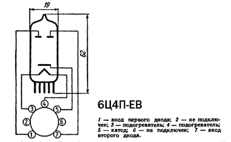 6Ц4П-ЕВ кенотрон двуханодный косвенного накала - предназначен для выпрямления переменного напряжения тока промышленной частоты, относится к разделу электровакуумных приборов и ламп различного назначения. По конструкции состоит из вакуумно-герметичной, жесткой оболочки, внутри которой отсутствует кислород.