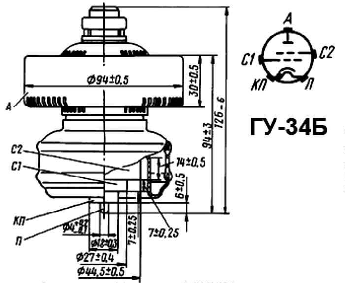 Генераторный тетрод ГУ-34Б для работы в качестве генератора и усилителя высокочастотных колебаний на частотах до 250 Мгц.