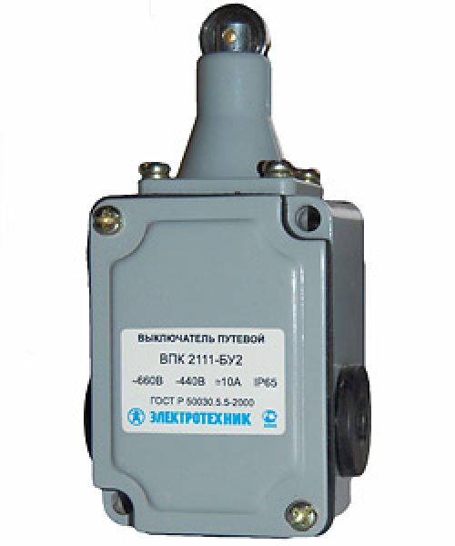 ВПК-2111-АУ2 выключатель путевой концевой мгновенного действия применяется для коммутации  электрических цепей управления переменного  напряжения до 660В частоты 50 и 60Гц и  постоянного напряжения до 400В. Выключатель состоит из металлического корпуса, разделенного перегородкой на два отсека, в одном из которых расположен контактный блок, в другом - переключающий механизм мгновенного действия.