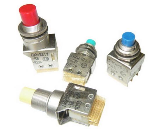 ПКН107М-5 переключатель кнопочный с цветной кнопкой, без подсветки, с фиксацией, с одной или двумя группами переключателей предназначены для работы в электрических цепях постоянного и переменного тока в РЭА.