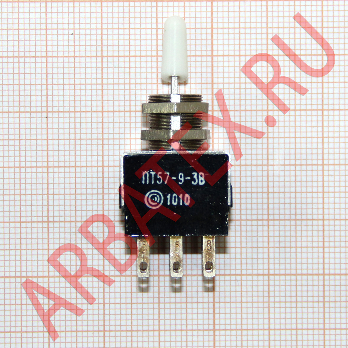 ПТ57-9-3В переключатель тумблерный, применяется для коммутации цепи сигнализации, питания и управления с напряжением 1х10-4В - 250В, силой тока 1х10-6А - 16А и коммутируемой мощностью до 1900Вт. Тумблеры выполняются с рычажным приводом, позволяющим укреплять резиновый защитный протектор и так и без него. В зависимости от фиксации рычага тумблеры выпускаются с фиксацией в трех положениях, в одном крайнем и среднем положениях и только в среднем положении. Монтаж проводов проводится пайкой.