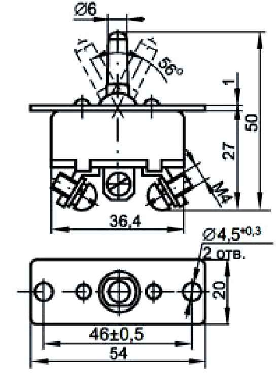 ППН-45К однополюсный перекидной переключатель на 3 положения Вкл-Выкл-Вкл, с фиксацией и с нейтральным положением, применяется для коммутации цепей сигнализации и управления постоянного тока с напряжением 27 Вольт и силой тока 35 Ампер. Тип механизма переключения – рычажный.