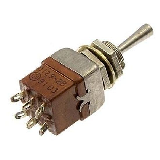 ПТ29-1В миниатюрный переключатель тумблерный применяется в цепях постоянного и переменного тока в радиоэлектронной аппаратуре. Тумблеры  изготавливаются во всеклиматическом исполнении, являются изделиями ручного управления и предназначены для   объемного монтажа. Монтаж проводов проводится пайкой.