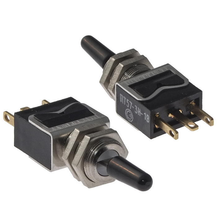 ПТ57-1Н-3В переключатель тумблерный, применяется для коммутации цепи сигнализации, питания и управления с напряжением 1х10-4В - 250В, силой тока 1х10-6А - 16А и коммутируемой мощностью до 1900Вт. Тумблеры выполняются с рычажным приводом, позволяющим укреплять резиновый защитный протектор и так и без него. В зависимости от фиксации рычага тумблеры выпускаются с фиксацией в трех положениях, в одном крайнем и среднем положениях и только в среднем положении. Монтаж проводов проводится пайкой.