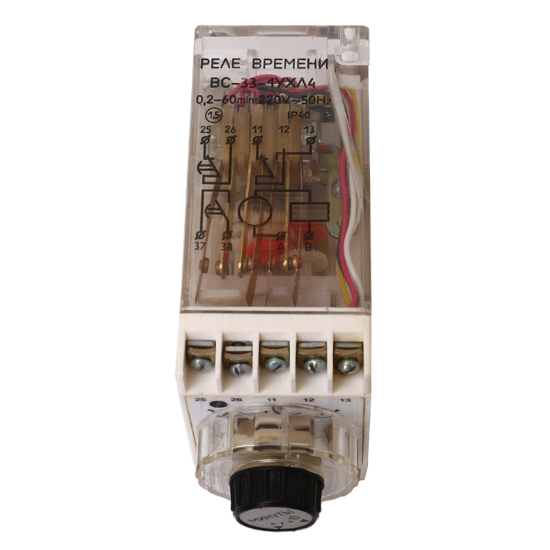ВС-33-1 0.2-60сек 220В реле времени выступающего исполнения с передним присоединением проводов применяется для получения независимой выдержки времени. Реле времени применяется в схемах, где необходимо автоматически выполнить какое-то действие через определенный промежуток времени. Реле электромеханическое, с приводом от синхронного электродвигателя. Механизм реле размещен в пластмассовом корпусе, на лицевой части реле выведен переключатель поддиапазона установок и ручка установки выдержки времени. В комплекте с реле может поставляться колодка для крепления реле.
