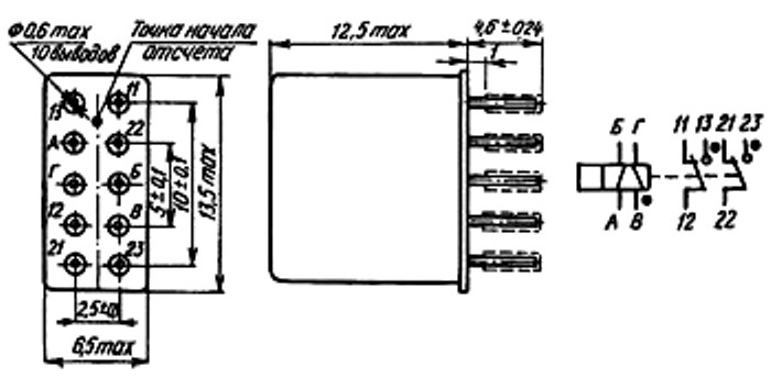 Конструкция реле обеспечивает фиксированное положение контактных групп в любом состоянии реле при обесточенной обмотке. При подключении положительного полюса источника питания к выводу обмотки, обозначенному А, а отрицательного - к выводу этой же обмотки, обозначенному Б, замыкаются контакты 12 и 22 с контактами 13 и 23; затем при подключении положительного полюса источника питания к выводу обмотки, обозначенному В, а отрицательного - к выводу этой же обмотки, обозначенному Г, замыкаются контакты 12 и 22 с контактами 11 и 21. Одновременная подача напряжения на выводы А, Б, В, Г не допускается.