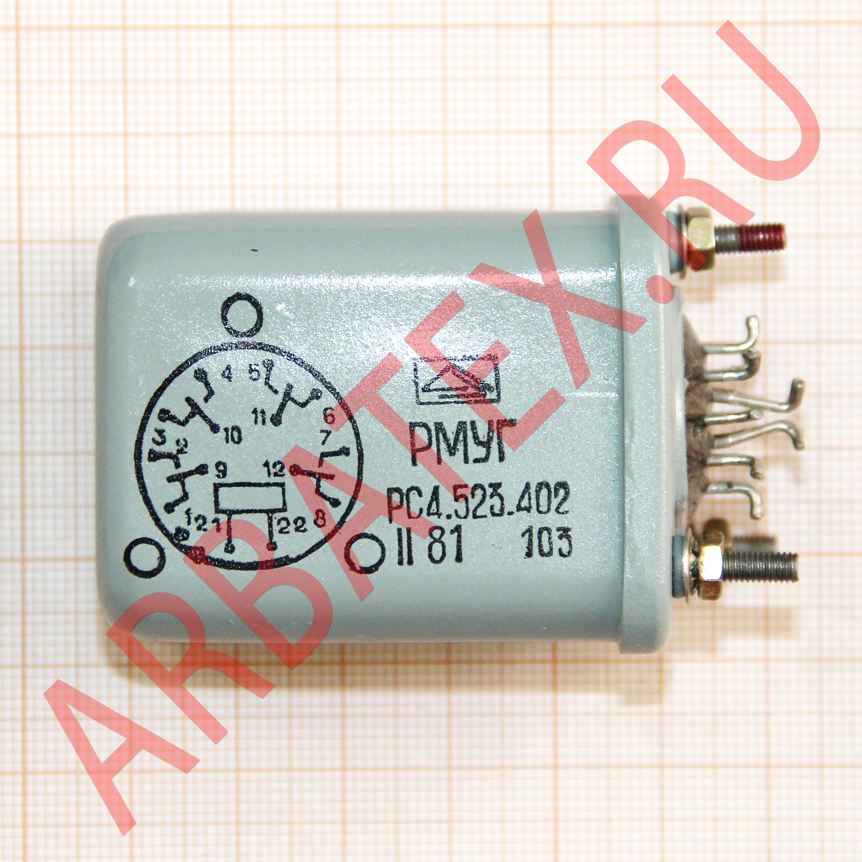 РМУГ РС4.523.402 реле электромагнитное постоянного тока применяется для получения независимой выдержки времени. Реле времени применяется в схемах, где необходимо автоматически выполнить какое-то действие через определенный промежуток времени. Механизм реле размещен в пластмассовом корпусе, на лицевой части реле выведен переключатель поддиапазона установок и ручка установки выдержки времени.