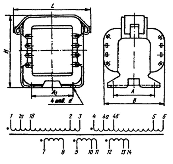 Накальные трансформаторы типа ТН в зависимости от габаритной мощности, типа магнитопровода, напряжения сети питания и климатического исполнения имеют различные габаритные и установочные размеры. Конструкция трансформаторов разработана для установки на металлическом шасси аппаратуры или на печатных платах с креплением их винтами.