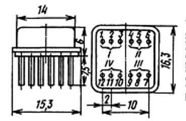 Транзисторные сборки ГТС609Б, состоящие из четырех германиевых диффузионио-сплавных р-п-р переключательных высокочастотных маломощных транзисторов.
